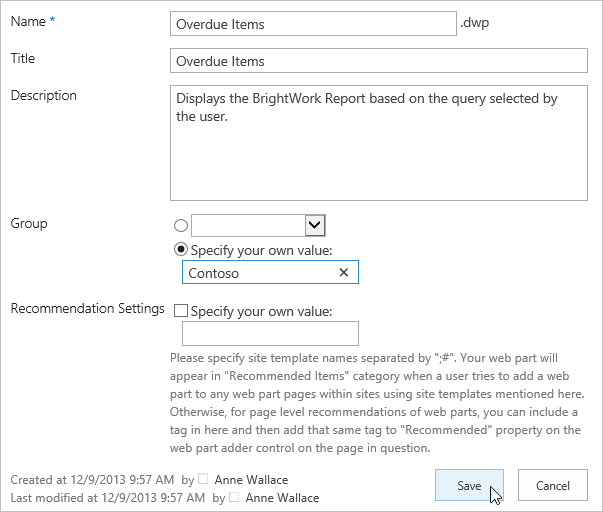 Web parts with a large number of configuration options, such as BrightWork Reporter, have an almost infinite number of final configuration possibilities. Getting the report configuration right can take a while! Once you get it right, repeating this work can be a pain. Fortunately, SharePoint allows you to export the web part and upload it to the site collection Web Part Gallery for easy reuse.