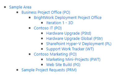 - A Project Office ‘parent site’ to manage projects and portfolios including roll-up reporting dashboards.